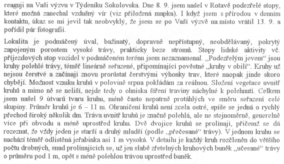 Do mozaiky svědectví dobře zapadá i následně získaná informace od pana Rojíka o kruzích polehlé trávy nad Horní Rotavou v místě na spojnici Kraslice - Šindelová. Popis jevu je natolik zajímavý, že jej uvádíme v originále. Přestože fotografie byly pořízeny až po měsíci, jsou na nich kruhy dobře patrné. Po 13.8. se nad tímto místem vyskytla jen jedna další bouřka, která by případně mohla polehnutí způsobit, ovšem jen den před nálezem pana Rojíka, což je v rozporu s vyschnutím polehlé trávy.