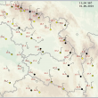 Data z automatických meteostanic v prostoru severovýchodních Čech mezi 10:00 a 12:00 SEČ (11:00 a 13:00 UTC)