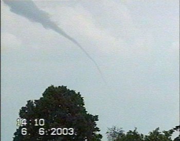 Celý jev začal přibližně ve 14:05, kdy se z okraje celkem nijak rozvinutého a nevýznamného bouřkového mraku vysunul jakoby "vlající hadr".-), ze kterého začal pomalu vystupovat známý "chobot". Než jsem našel alespoň webkameru, chobot se prodloužil. Zda dosáhl až k povrchu Země netuším, jeho konec byl schován za protějším kopcem. Chobot se postupně prodlužoval a "pokládal" do horizontální polohy (celkovou délku chobotu si netroufnu odhadnout) a asi po 5 minutách celý jev zanikl.
