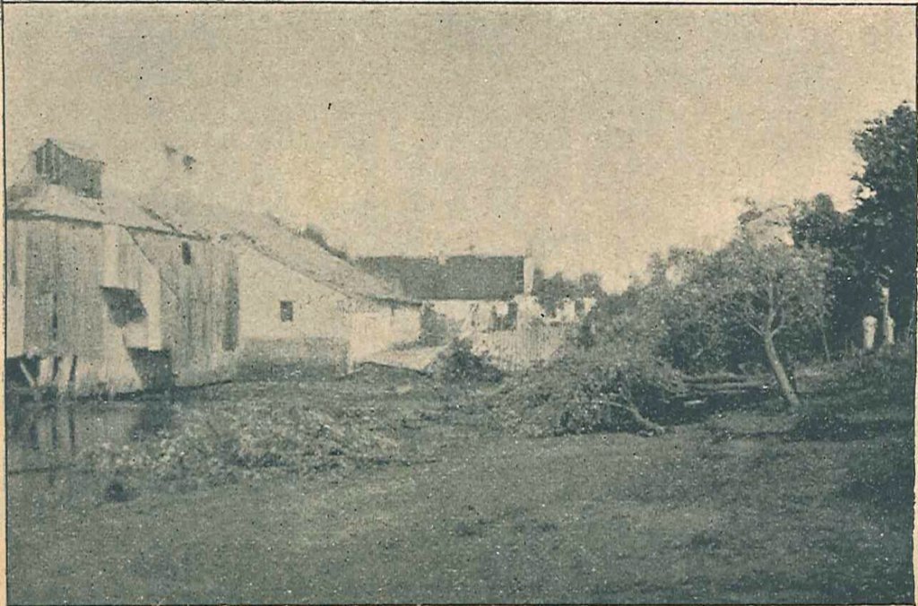 Cestou přes posečená luka brala vše, co ji v cestu přišlo (seno, stromoví, stohy poblíž hospodářství). Ze stavení p. Jukla byly smeteny téměř všechny tašky, vůz s obilím na poli stojící byl převrácen a snopy obilní daleko široko rozmeteny po polích, vrata vyvrácena a daleko odnesena, zděné pilíře vysunuty z polohy. Poblíž silnice osm mohutných topolů bylo vyvrácených i s kořeny.